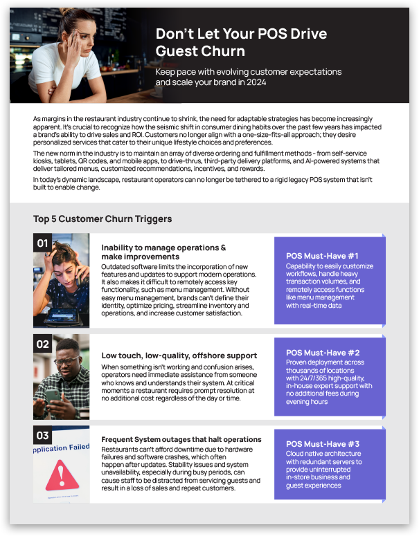 Brands interested in scaling need agile, reliable POS solutions capable of swiftly embracing and integrating new systems. Check out the “Top 5 Reasons Your Existing POS is a Recipe for Guest Churn” to learn more about: